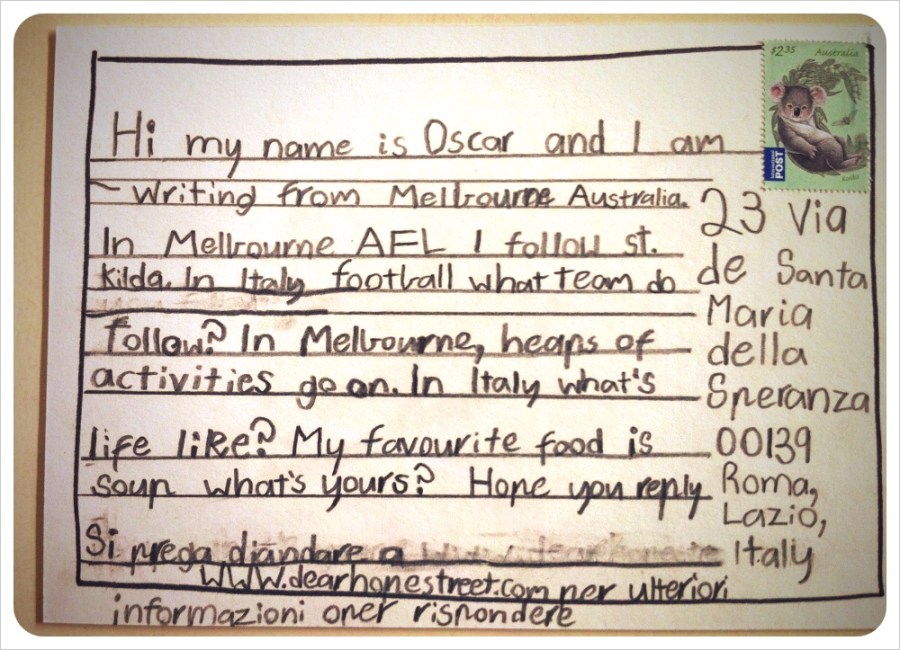 Il mio nome è Oscar e vi scrivo da Melbourne, Australia. A Melbourne AFL seguo St Kilda. In Italia il calcio che squadra segui? A Melbourne, cumuli di attività di andare avanti. In Italia, Com’è la vita? Il mio cibo preferito è la zuppa, ciò che è tuo?