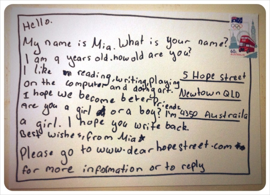 Hi Mia, sorry its taken me so long to reply. Your beautiful post card sits on my desk where I can admire it every day. We like living in this house. We tell everyone we “Live in Hope”. I have a husband and a son. I am a teacher at the local school and I was very impressed to see your art project. I teach IT and History. Did many people get a reply?