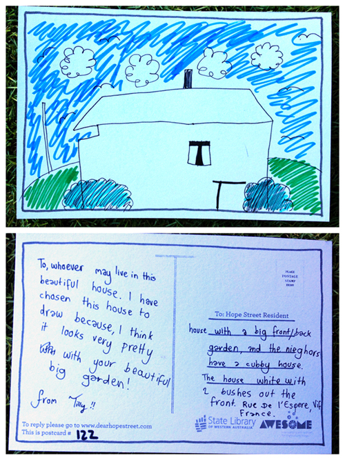 Hello Tilly, Thanks for your card. It was a big surprise to receive a card of Australia. Good luck for your studies. Don’t forget my adress because if you decide to go in !France, it will be a pleasur to receive you. Have a good night (or good day !!!).