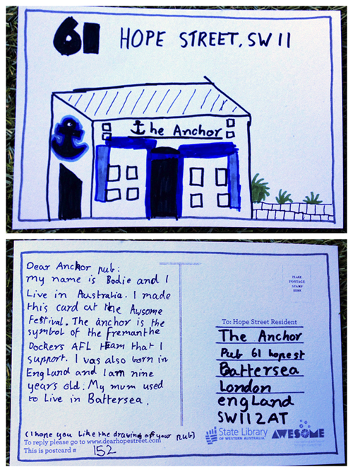 We just received this postcard today at The Anchor Pub! What a lovely surprise! I love what this organisation is doing! We get a lot of Australian people around Battersea! We ourselves are Irish people running the pub so AFL is something we love as it is very much the same as Irish Gaelic Football! Thank you for the lovely drawing Bodie! We will put it up behind the bar for all our customers to see!