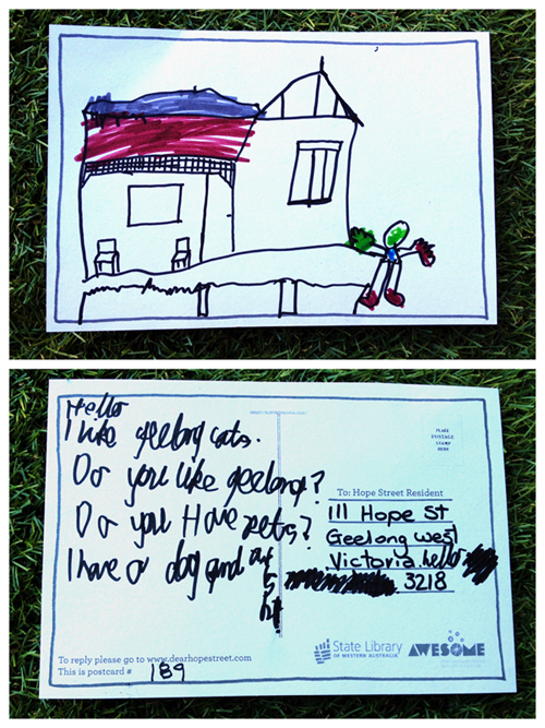 I live at 111 Hope Street, Geelong West. Thank you for the lovely drawing of my house. I have only lived here for three months. I do like pets. I have a small dog called Alice. She is white and ginger in colour. Alice likes her new house because she can sit on the front verandah and watch people walking past. When she sees another dog go by she barks to say hello.