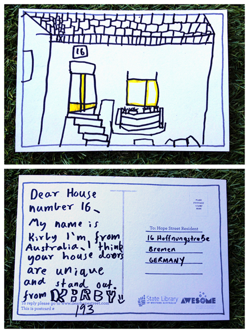 Hello Kirby! My name is Maike and I was very pleased to get your extraordinary beautiful postcard today (Nov 20). It only got one very, very tiny dog ear on its long journey, and it is invited to stay with me and my husband as long as it likes to. Because of your equally nice signature it is a pity we can’t see both sides at the same time. Thanks a lot and our best wishes, Maike