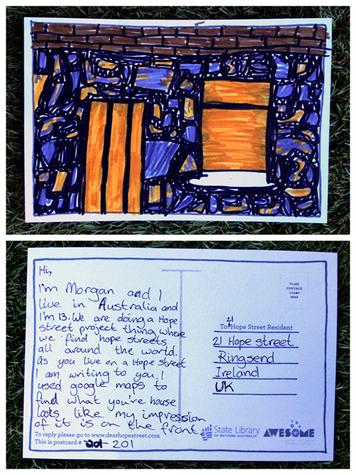 Hey Morgan – I live in 4 Hope Street, Ringsend – just a few houses away from this house – and I think you’ve done a GREAT job with your picture! I’m away in Tokyo right now, but I heard we received a postcard, too. I think this is a great project – we’re all lucky to be a part of it!