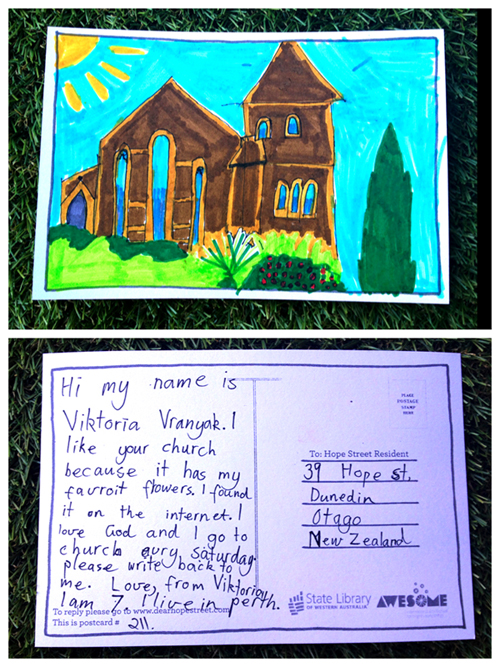 Thank you so much for your lovely postcard. What a fantastic drawing of our church It is very old and was built way in 1874, meaning that it is nearly 140 years old!! There weren’t many buildings around when it was built and there weren’t any cars either.