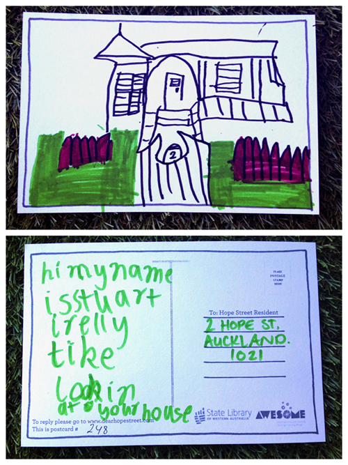 This is our place! Thank you for the postcard, love the concept. Stuart did an amazing job of drawing our house! Our children enjoyed learning about the concept!