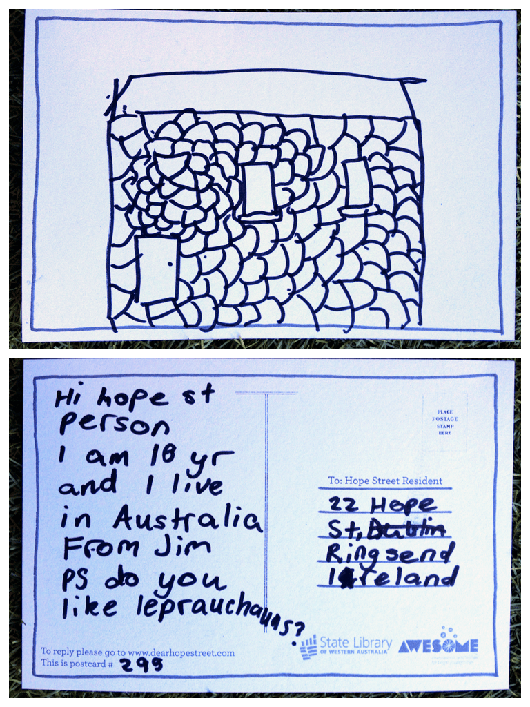 Hi Jim! My name is Jim, too. I live in 4 Hope Street in Ringsend, just a few houses away from this house. You’ve done such a good job drawing the house, I knew I recognised it! I just wanted to tell you that, and to say that I like leprechauns!