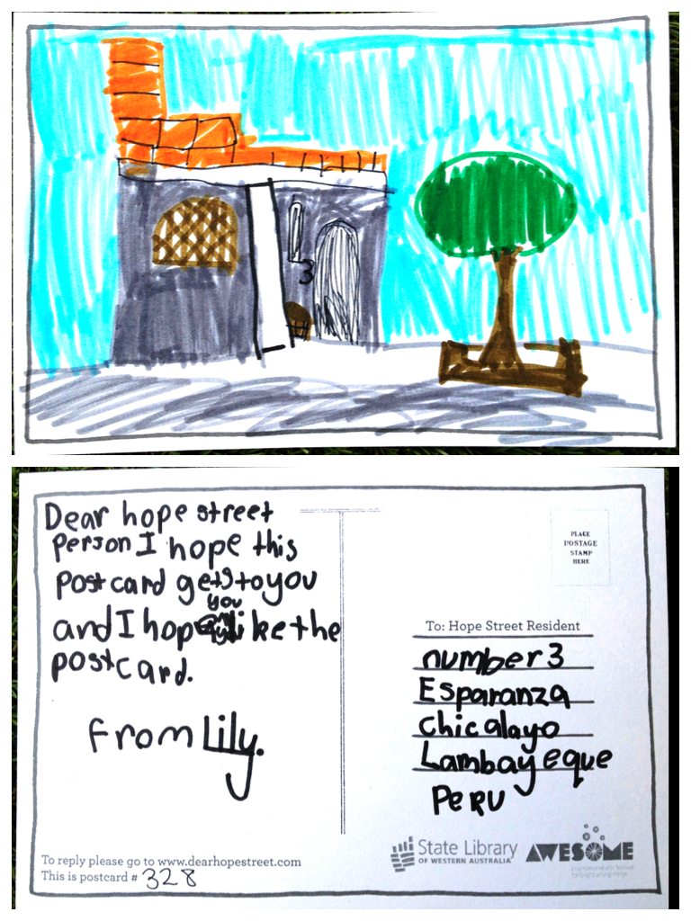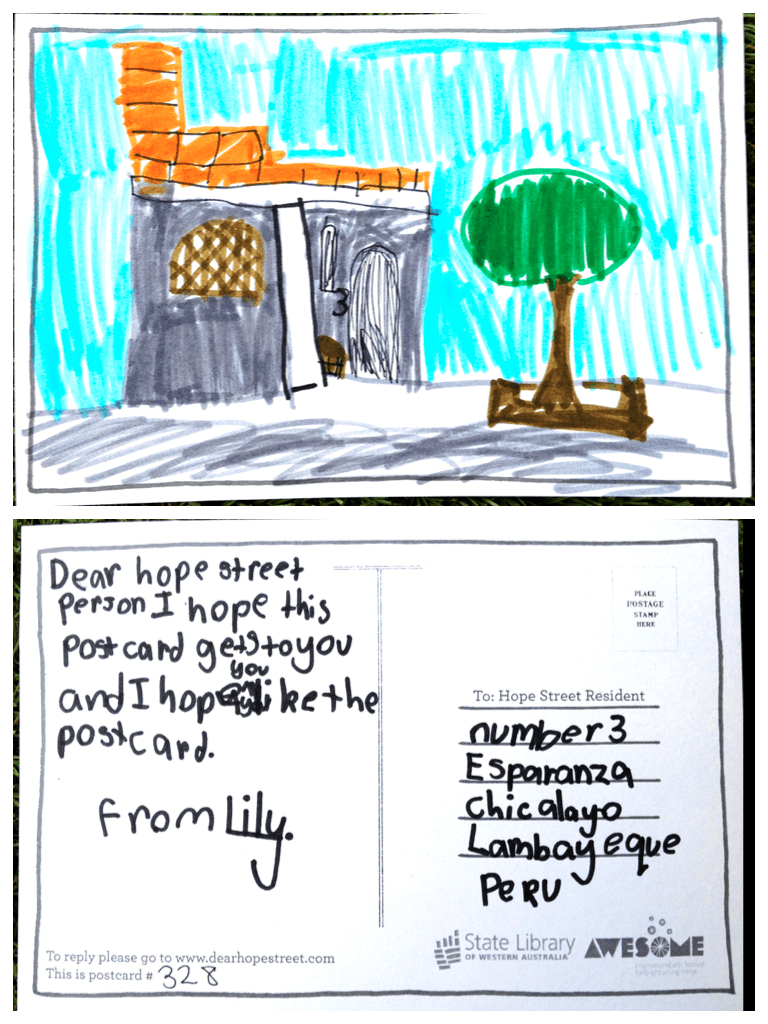 Translation/Traducción: Querido residente de la calle Esperanza. Espero que recibe esta carta y que le guste. De Lily.