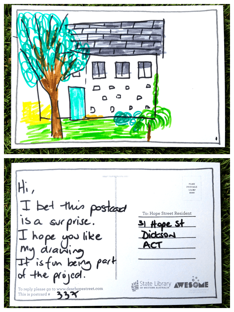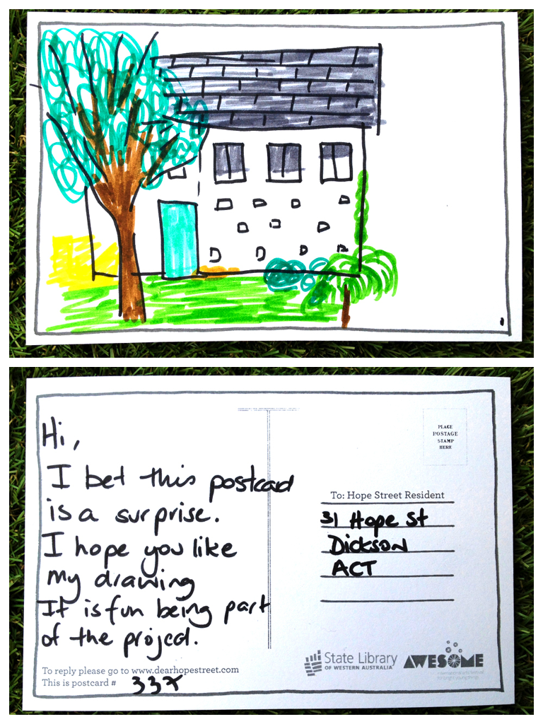 Dear Awesome – yes your card was a huge surprise and we love your drawing of our home. I moved to Canberra with my two youngest sons after their mother died following a long battle with cancer. For some time I didn’t think we would ever find the right house to re-build our family. After much searching however we discovered our little house on Hope Street. I took the name of the street as a sign that after such sadness we would find joy and happiness here. We know that there are many people, both in Australia and around the world, who do not have a warm house and food in the pantry as we do and we are very grateful for our life here on Hope Street. Thank you for your card and I hope you had a lot of fun working on this project. Best wishes to you and your family.
