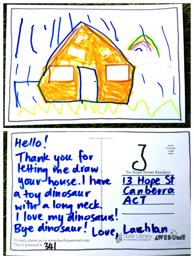Thank you for the lovely drawing of our house. We particularly like the rainbow! It’s great to live in Hope Street – with such a happy optimistic name – how could life not be great in the Hope Streets of the world? We like dinosurs too and also whales, penguins, and giraffes. Unfortunately we don’t have any at our house but our neighbour’s cat, Tiger, often comes to visit. Did you know there is a national dinosaur museum here in Canberra? You might like that. Sometimes we visit Perth to visit our relatives in Innaloo.