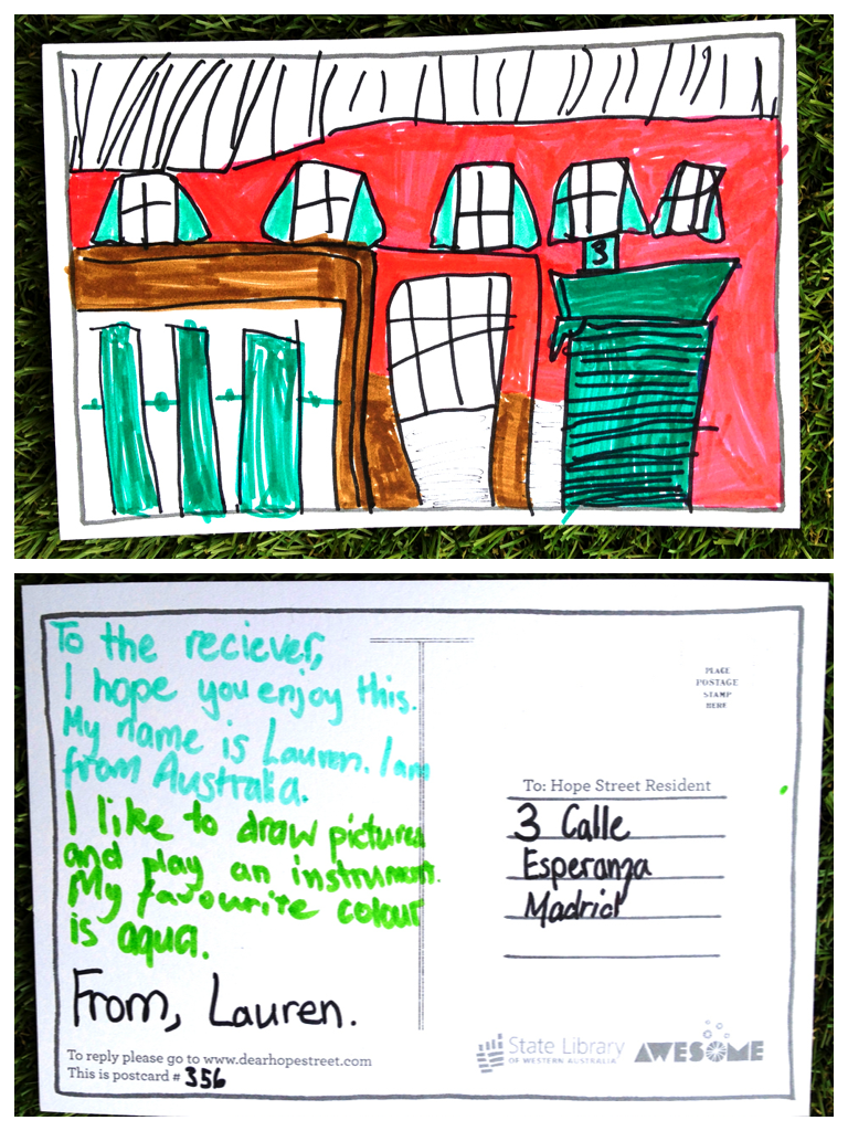 Translation/Traducción: Al receptor. Espero que le guste esta carta. Me llamo Lauren. Soy de Australia. Me gusta dibujar y tocar instrumentos. Mi color preferido es aqua. De Lauren.