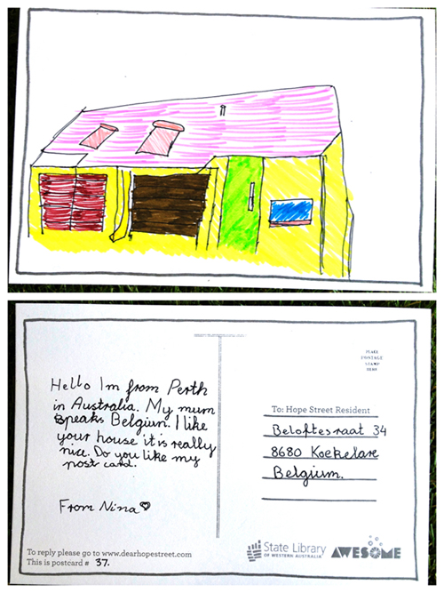 Translation/Traduction Bonjour. Je viens de Perth en Australie occidentale. Ma mere parle belge. J’aime votre maison. Elle est très jolie. Ma carte postale vous plaît? Nina