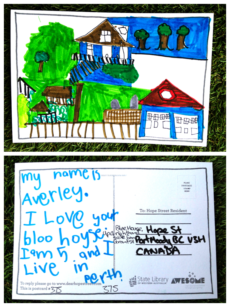 We are so excited to learn the postcards have been posted and my five year old “artist” daughter is so looking forward to seeing if she gets a message back from “the most beautiful blue house ever…” in Port Moody Vancouver, Canada.