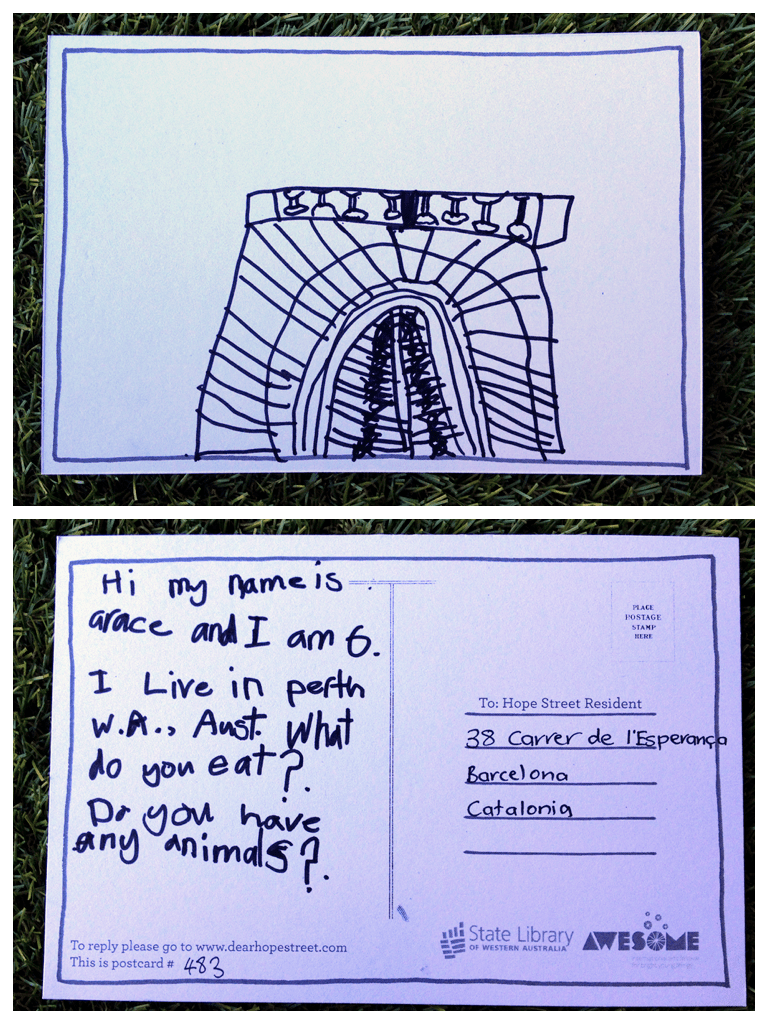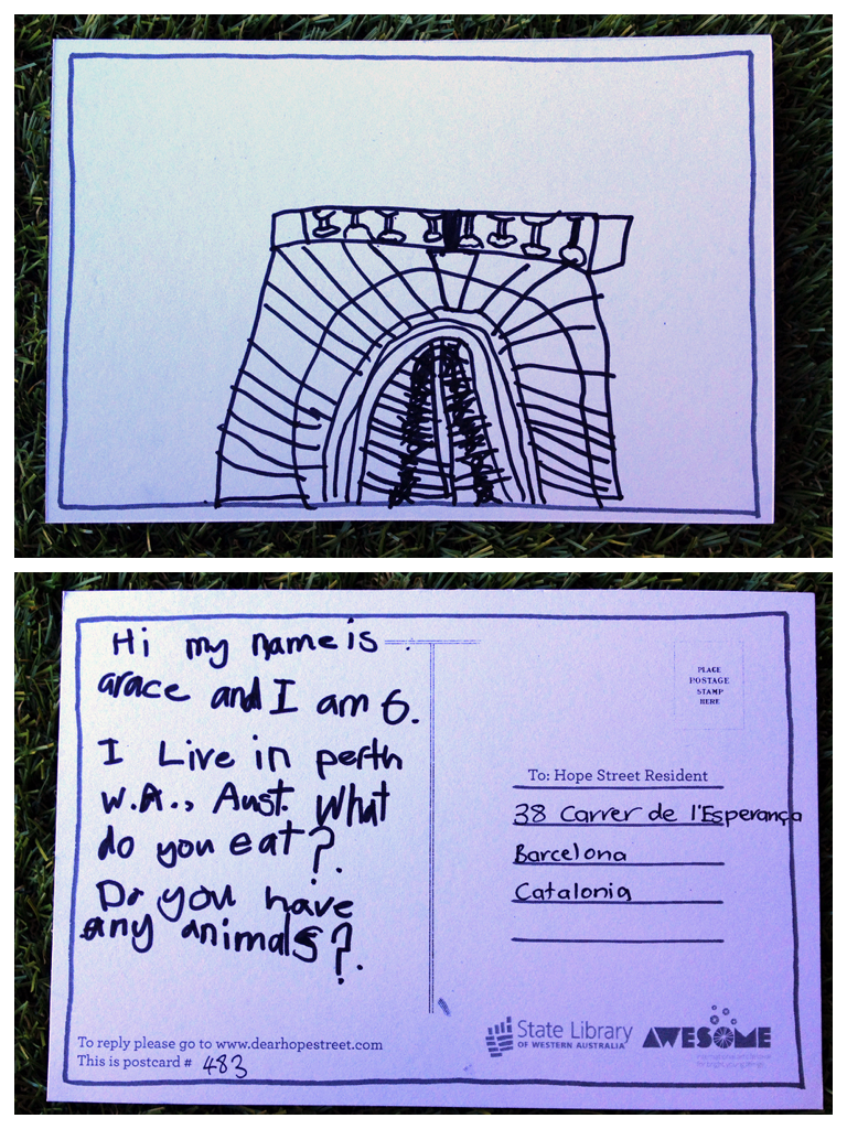 Translation/Traducción: Hola. Me llamo Arace y tengo 6 años. Vivo en Perth, Australia. Qué come Vd? Tiene animales?