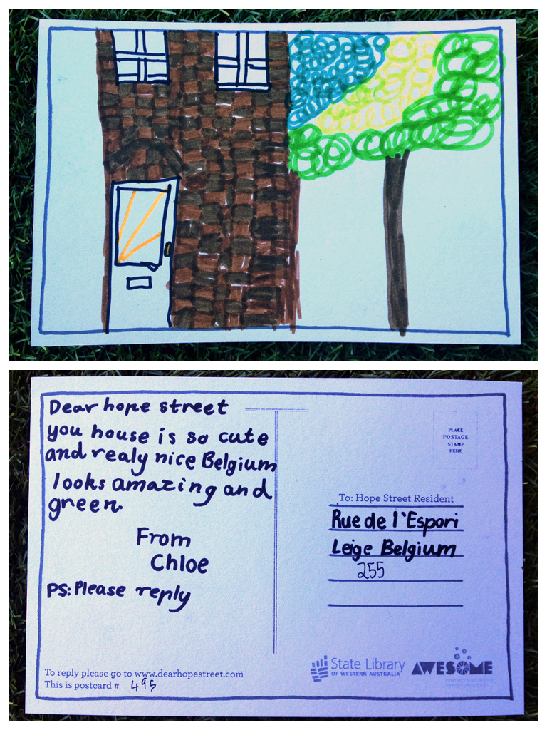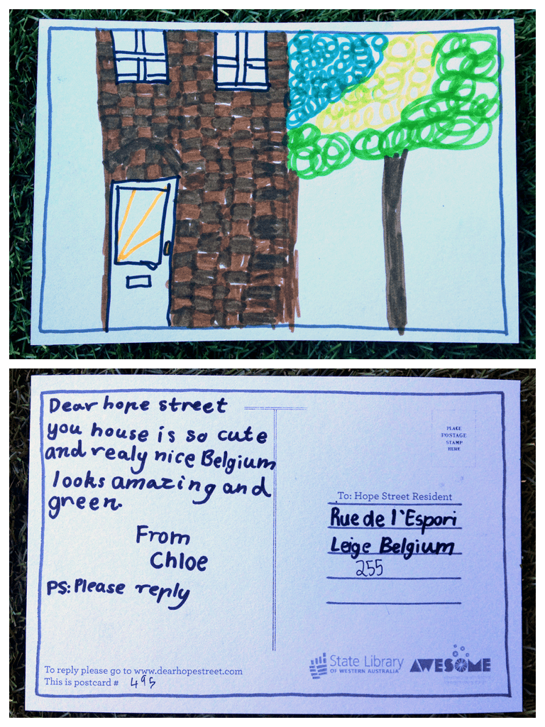 Translation/Traduction: Cher rue de l’espère Votre maison est si mignonne et très jolie. La Belgique paraît incroyable et verte. Chloe. Ps. Répondez s’il vous plaît.