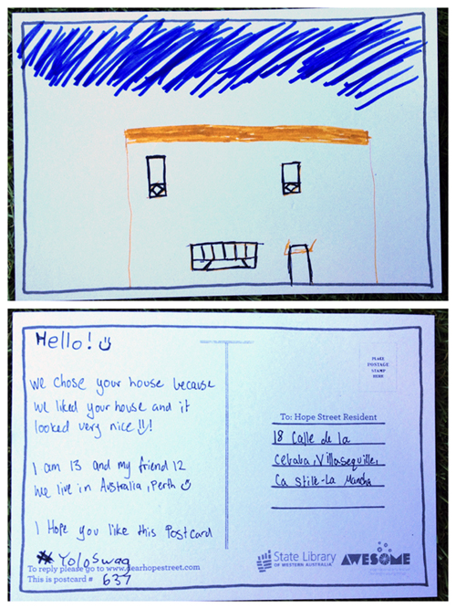 Translation/Traducción: Hola! ☺ Hemos escogido su casa porque nos gusto su casa y parece muy linda! ☺ Yo tengo 13 años y mi amiga 12. Vivimos en Australia, Perth. ☺ Espero que les guste esta carta. Yolo Swag.