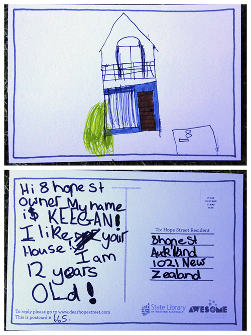 I was really stoked to get your card, Keegan! You got the colour of my porch just right!. I’m John and I like my house too – and I like living in a street called Hope. I have a grandson Max who’s the same age as you. My very best wishes for your future.