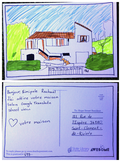 We were very surprised to receive your postcard with this beautiful drawing of our house(well done !)…even more surprised to receive it from a stranger in Australia. So far away and so close in a way…Your project is really great and we feel very lucky to be part of it now: so thank you for choosing our house. What would you think of sending us a drawing of your house ?