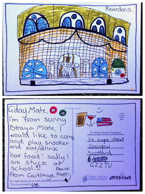 Thank you for your lovely postcard. What a lovely picture! It brightened up our day here on a wet morning in Glasgow.