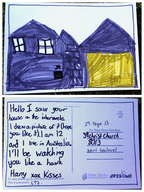 Thanks for the lovely postcard. It made me smile. My name is Jo and my husbands name is also Jo. We have a 6 month old of baby boy and a sphynx (hairless) cat. Good luck with your art project. We wish you a lifetime of happiness. xxx