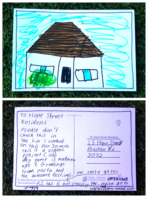 I like the picture that you drew. It looks like my house. I will display your postcard on my mantlepiece in my loungeroom.