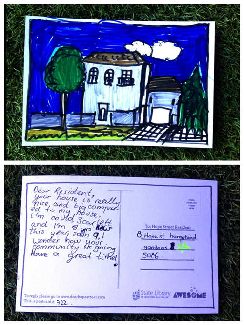 Dear Scarlett, sorry about the delay we put the postcard away and forgot! I really like your drawing, you have really put some effort into it. I’m Saoirse (you pronounce it sorsha), I am 11 and in year 5. You asked about my community? It is going great! I go to St Monica’s Parish school and it is near by. I have a mum, dad and a pet dog Molly, she is so cute. My best friends name is Tarrah and she is very funny and nice. Hope to talk to you soon!