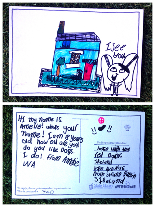 My name is Adie. I am 50 years old. I am sorry I am only writing to you now but I have not been well. Thank you so much for your wonderful picture of my house. I love love love it! I wonder what your house is like? I work with children and I think that you are a very talented artist. I love dogs. I have a Cavalier King Charles. Her name is Hopie and she is 14 years old – 98 in our years. She’ll be 100 years old at Halloween. She is brown and white. I wish I could send you a photo of her. She snores alot! Anyway thanks again.