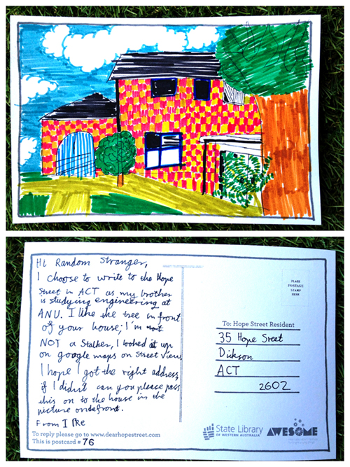 Dear I Pre (I’m not sure I’m reading that correctly?) – we received your postcard this afternoon and we think it’s BEAUTIFUL. The tree you liked at the front of our house is one of the many that line our street; they were planted over 60 years ago when all the houses were built and they are oak trees. In summer they make Hope street into a shady green tunnel but in Autumn the leaves and acorns get EVERYWHERE. Because we have lots of trees here, we also have lots of possums, which can be very funny to watch but a bit scary when they walk over the roof in the middle of the night … Thank you so much for sending us your postcard with the beautiful picture you drew. We think this is an AWESOME project and I’m glad you chose us. Sara xox
