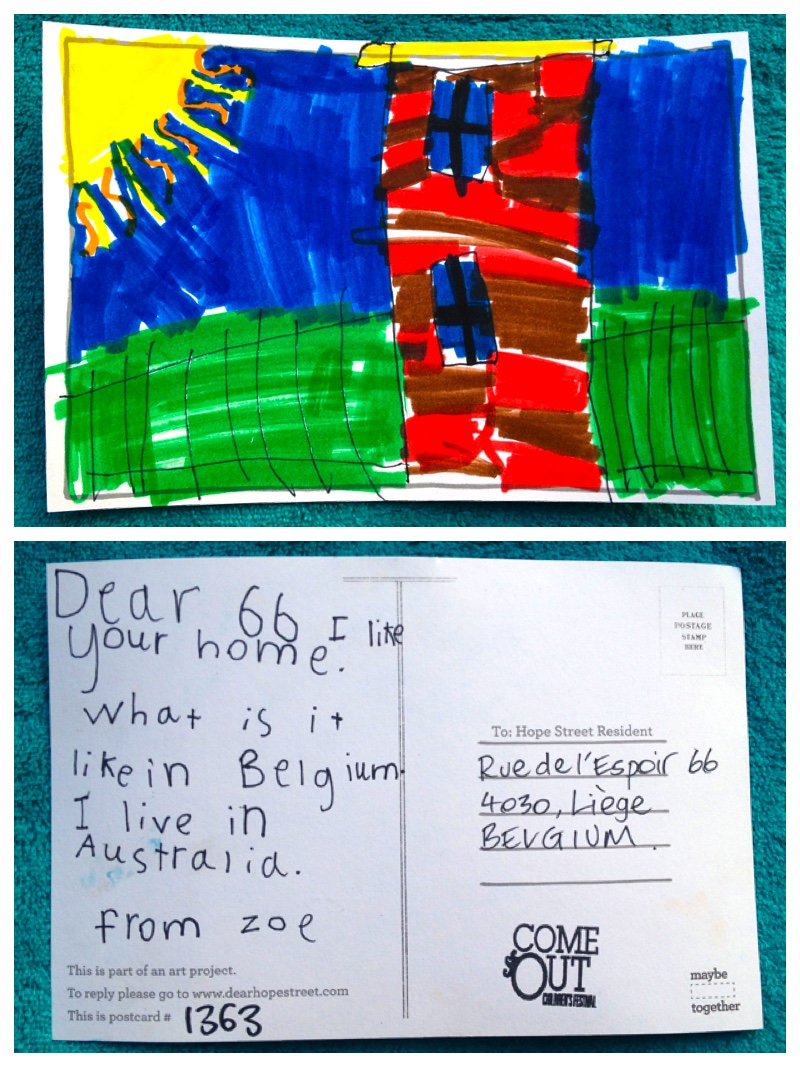 We are the housers of the 66th Hopestreet In grivegnée Belgium. Thank you so much for your lovely postcard! It is so amazing to receive your card one morning, coming from the other side of the earth!