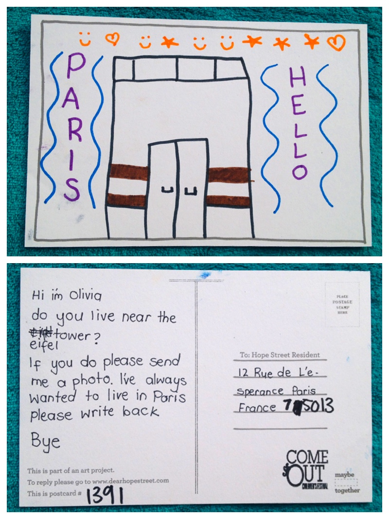 Translation: Salut, je m’appelle Olivia. Habites-tu près de la Tour Eiffel? S’il te plaît, envoie-moi une photo. J’ai toujours voulu vivre à Paris. S’il te plaît, réponds-moi. Salut.