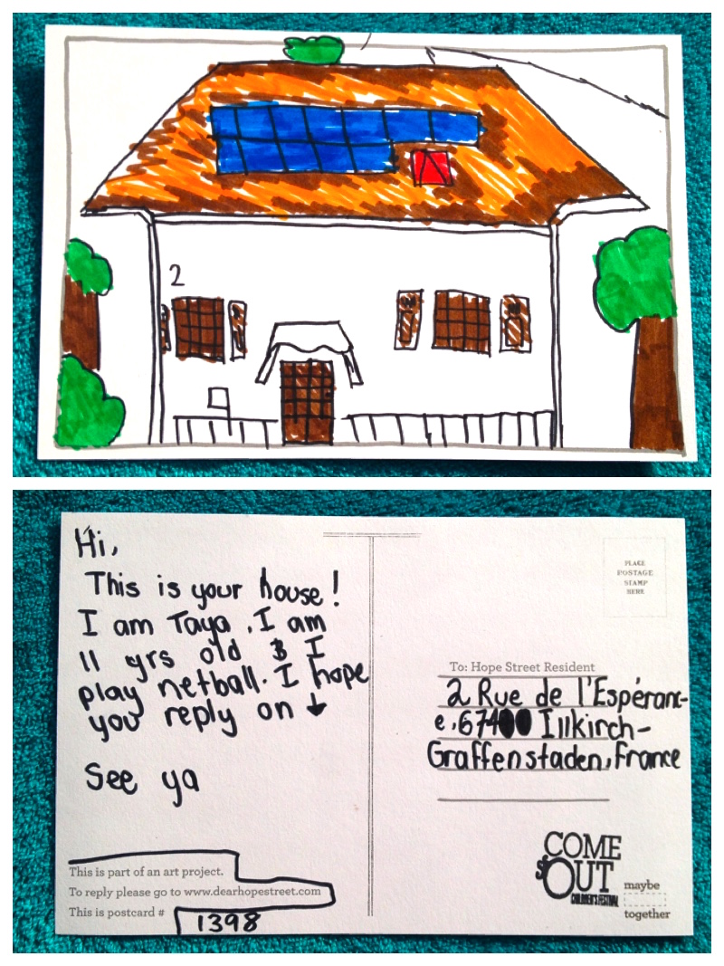 Translation: Salut ! Cette maison est la tienne! Je suis Tanya. J’ai 11 ans et je joue au netball. J’espère que tu répondras ⎢ À plus.
