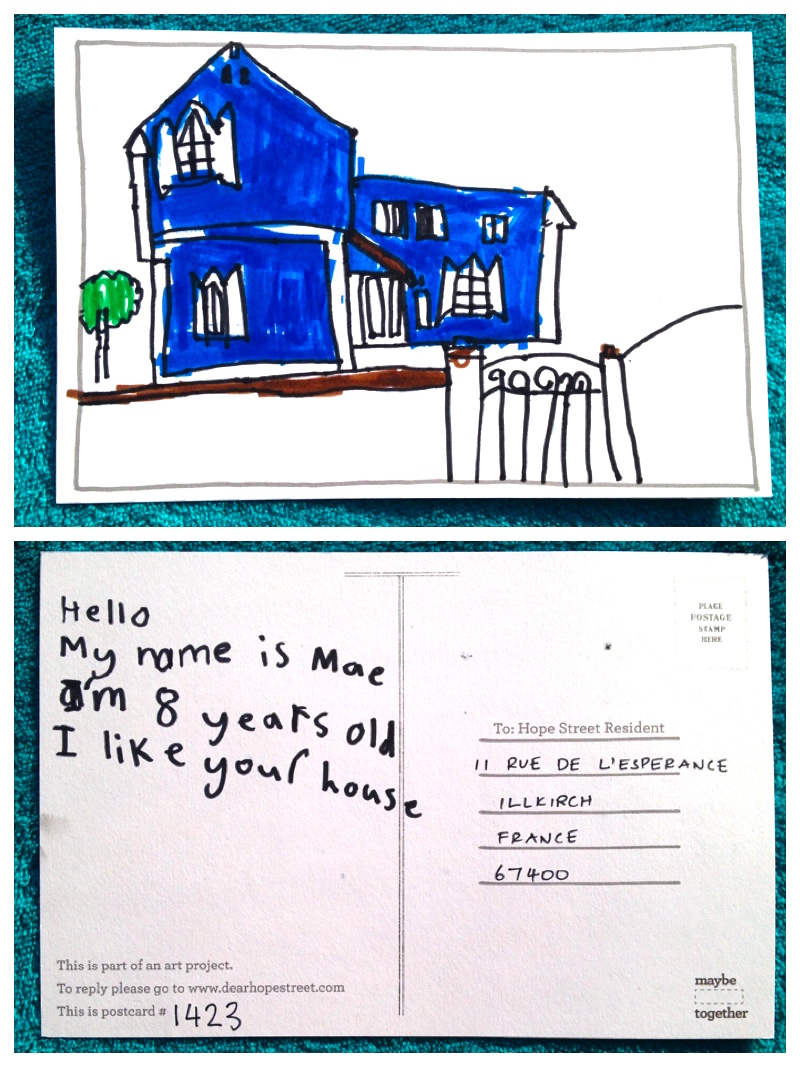 Translation: Bonjour, Je m’appelle Mae. J’ai huit ans. J’aime ta maison.