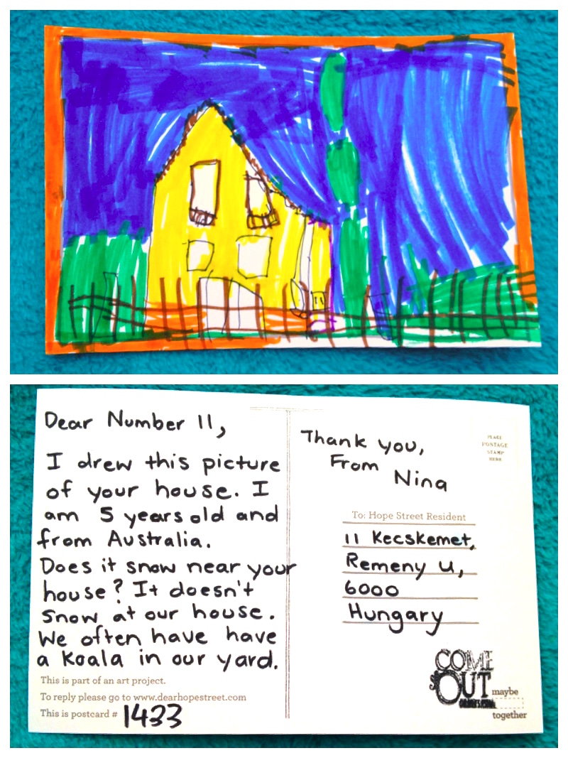 Translation: Kedves 11-es! Ezt a képet rajzoltam a házadról. 5 éves vagyok és Ausztráliában lakom. Szokott havazni ott ahol a házad van? A mi házunknál nem havazik. De gyakran jön koala a kertbe. Köszi! Nina