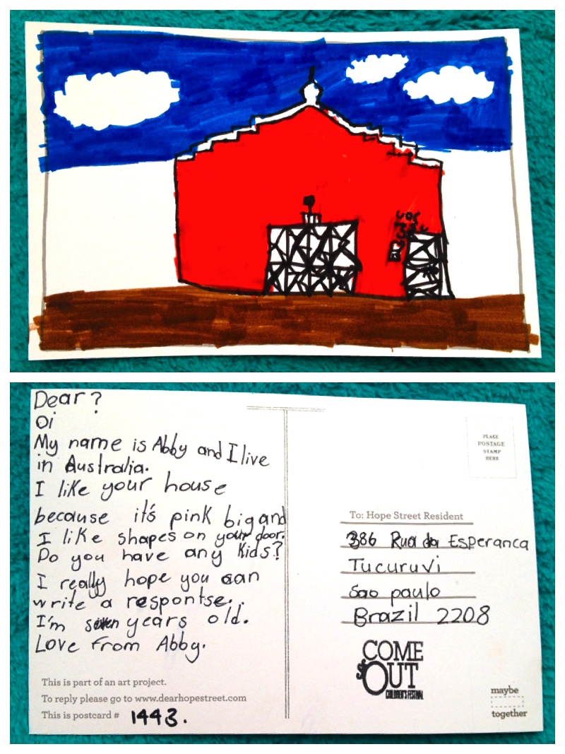 Translation: Estimado? Oi. Meu nome é Abby e eu vivo na Austrália. Eu gosto de sua casa porque ela é rosa e grande e eu gosto dos formatos em sua porta. Você tem algum filho? Eu espero muito que você pode mandar uma resposta. Eu tenho sete anos. Com amor, Abby.