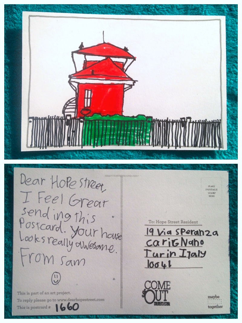 Translation: Ciao Residente della Strada della Speranza, mi sento benissimo inviando questa cartolina. La tua casa sembra davvero impressionante. Da Sam