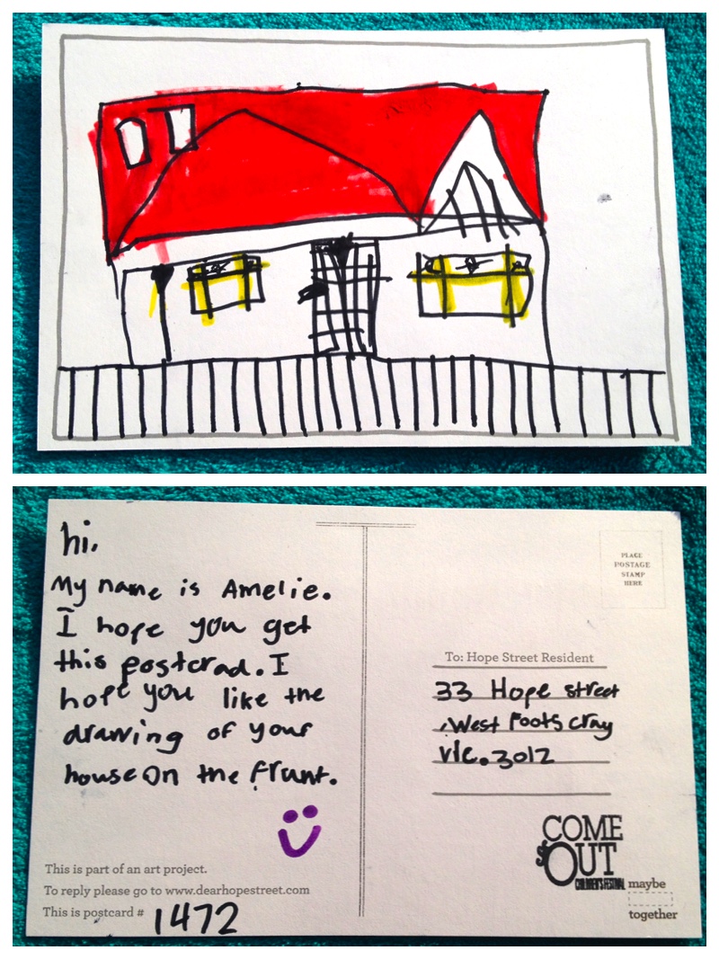 We love the picture you have drawn of our house. Our house has just been repainted and we now have a red front door to match our red roof. We moved here nearly 30 years ago and our 3 children have grown up in Hope Street. When we first looked at our house I remember thinking “I hope we get to live in Hope Street”. We have been very happy here! Thank you for sending the postcard.