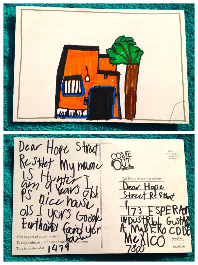Translation: Querido Residente de calle de la esperanza, Mi nombre es Hunter. Tengo nueve años de edad. ¡Bonita casa! Solía googlear y encontré tu casa.