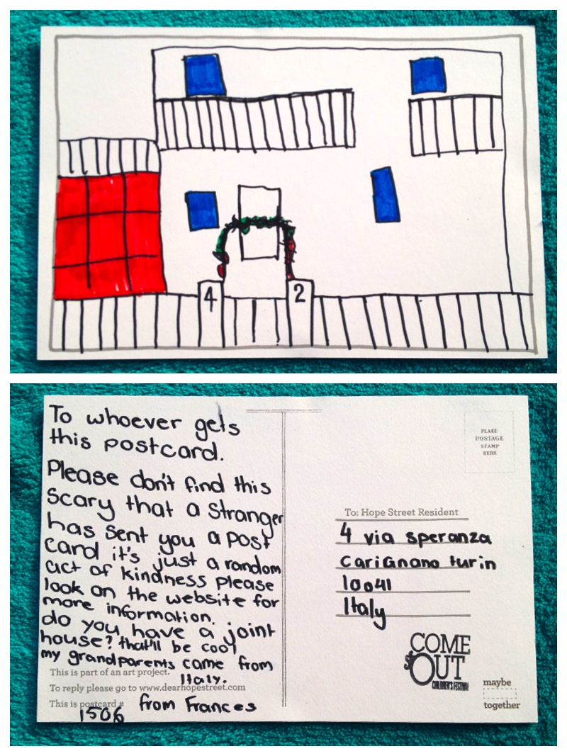 Translation: A chi ottiene questa cartolina. Per favore, non pensare que questo sia spaventoso, che uno sconosciuto ti abbia inviato una cartolina è solo un atto casuale di gentilezza. Ti prego di guardare il sito per ulteriori informazioni. Hai una casa congiunta? Sarà carina, i miei nonni provengono da Italia. Da Fances.