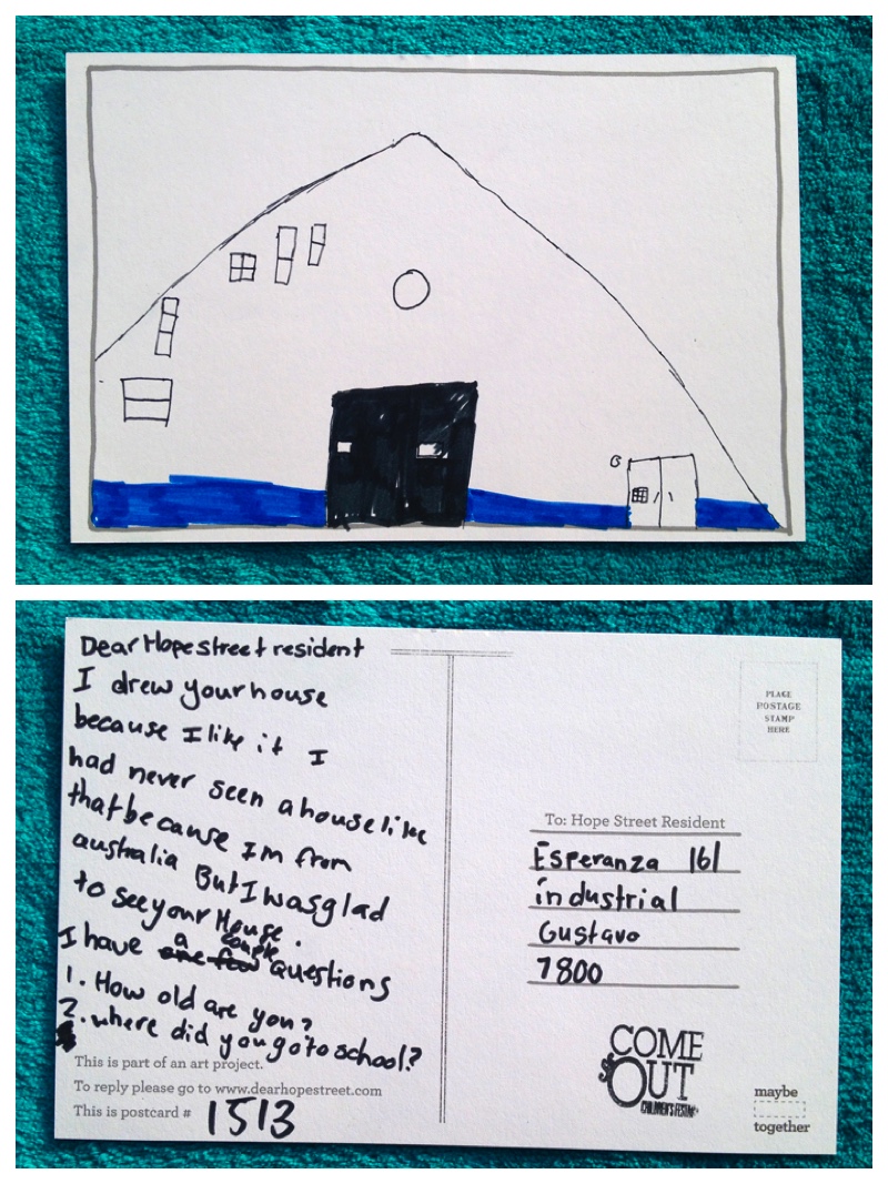 1. Translation: Querido Residente de calle de la esperanza, dibujé tu casa porque me gusta mucho, nunca había visto una casa así porque soy de Australia. Estaba contento de ver tu casa. Tengo algunas preguntas; 1. ¿Cuántos años tienes? 2. ¿A dónde fuiste a la escuela?