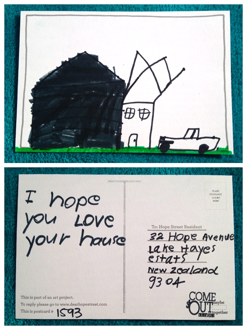 Hello from Queenstown New Zealand! We were so excited to receive your postcard today, and once we looked on your website we realised how lucky we were to be selected. What an awesome project you are doing! We do love our house very much, and are very blessed to live in it. We are a family of 5. Samuel is 8, Azaria is about to turn 6 at the end of June, and Brielle turned 1 in April. Shaun is a teacher, and Melissa is a town planning consultant, but more importantly a stay at home mum. We have already had a day off school from snow this winter, and we are excited about skiing and snowboarding this season. Thanks so much for drawing our house and sending us the postcard. Love Shaun, Melissa, Sam, Azaria & Brielle xxx