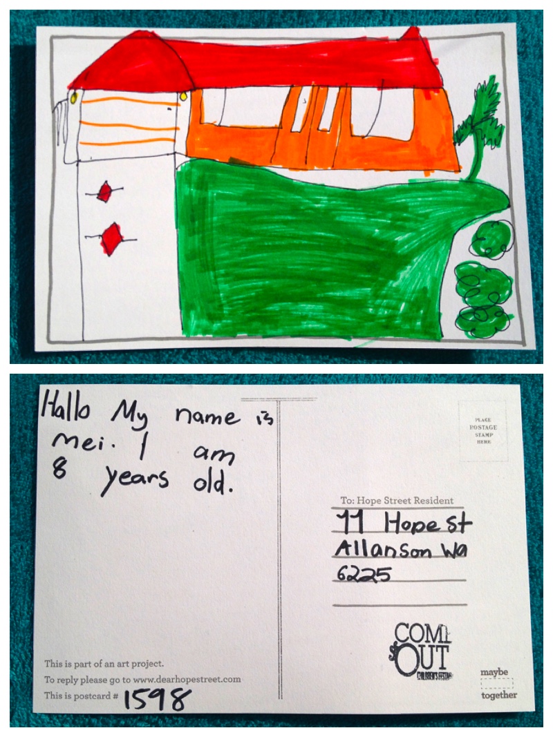 Thank you so much for my post card and beautiful drawing…. it is so colourful with the green grass and trees … I love the house with the red roof …. you have even put in a driveway with lights so I can park my car at night…. and a fence to keep the house secure