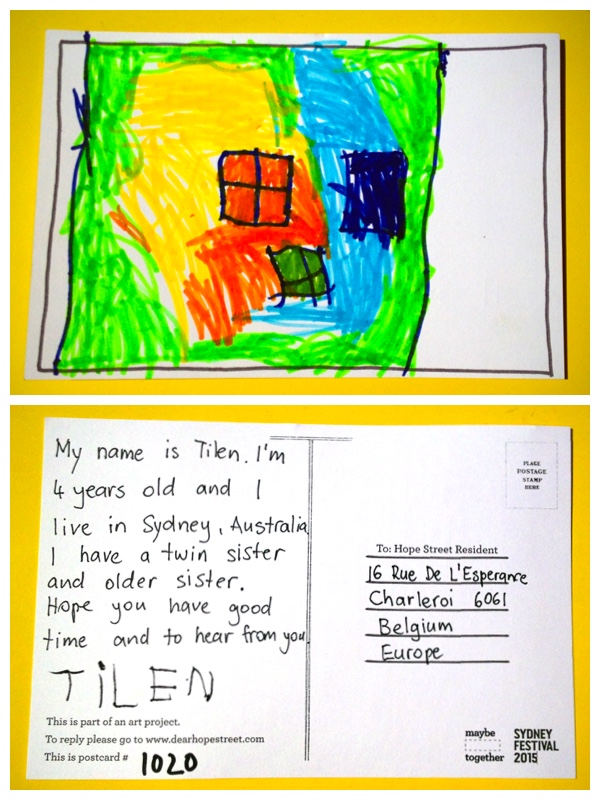 Translation: Mon nom est Kévin. J’ai 4 ans. J’habite à Sydney, Australie. J’ai une soeur jumelle et une sœur aînée. J’espère que vous passez un bon moment et que vous m’écrivez. Kévin.