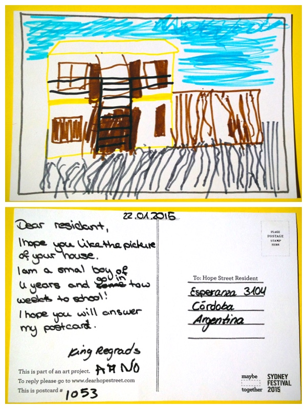 Translation: Caro residente, espero que você goste do desenho de sua casa. Sou um menino de 4 anos e em duas semanas eu vou para a escola. Espero que você responda o meu cartão postal. Atenciosamente, Anno.