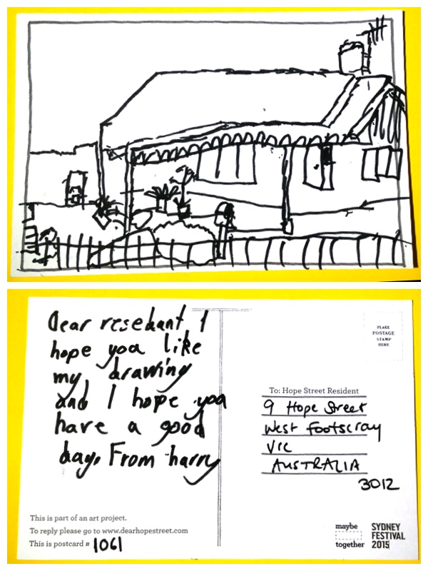 This is Ian, Elissa’s husband! I just wanted to add a few words to those that she already sent you to say thanks for your postcard and the lovely drawing of our house on it. It was such an unexpected surprise to find this waiting for us in our post-box on Friday evening and I have say that it is the first time I ever received anything like this!