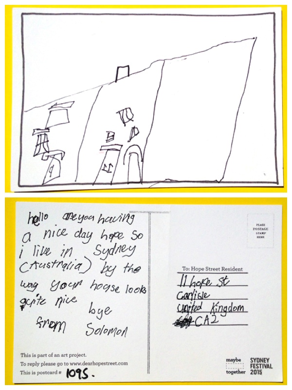 Hello Solomon. Thank you for you lovely art work of my house. I hope the weather is better in Sydney than here in Hope Street, Carlisle.