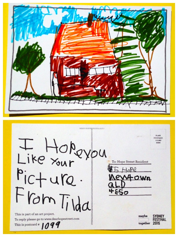 Thank you Tilda for our lovely artwork. We really treasure the Dear Hope Street art project. What a great idea! And we got one of the best artworks. We received on many years ago from Mia in Melbourne (Artworks series) and we still have it here. We will have to frame them and Hope that one day we will receive another one. I really like the colours you used in your drawing, they are very like the colour of our house in real life. I like that you have put so many trees around our house – we really try to fill our garden with trees to attract the birds. When we tell people where we live, we like to tell them that “we live in Hope”. Thank you again. My husband will probably want to write a thank you note when he gets home from work this afternoon also.