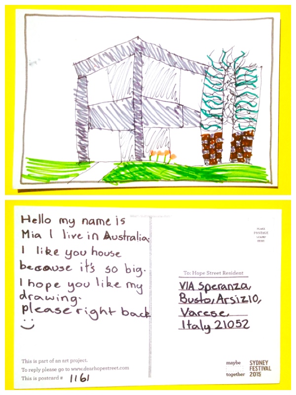 Translation: Ciao il mio nome è Mia. Io vivo in Australia. Mi piace la tua casa, perché è così grande. Spero che ti piaccia il mio disegno. Scrivimi per piacere.