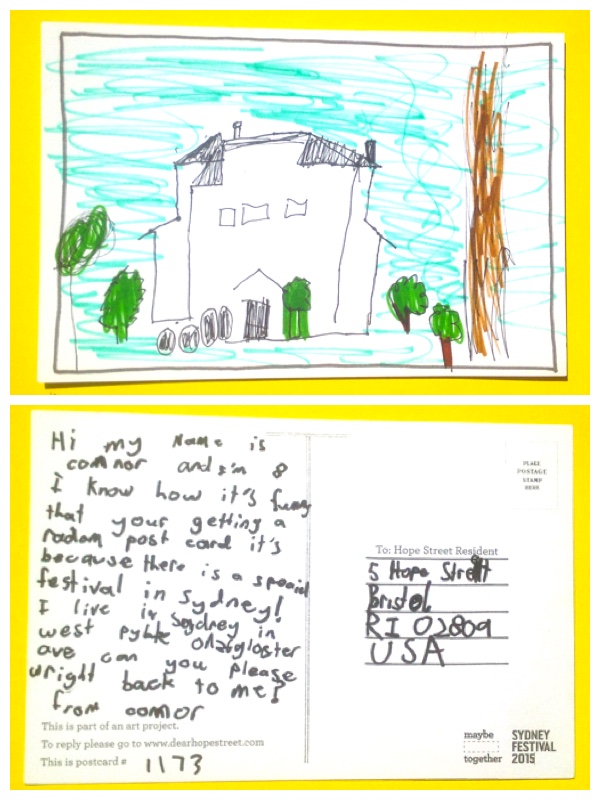 Hello Connor, Thank you for sending me the drawing of our home. You did a nice job. Did you find the picture on Google Earth? I would like to go and see Sydney some day. It is a long way from Rhode Island, 10,080 miles! I hope your special art project is a success! Keep up the good art work! Your new international friend, Denise