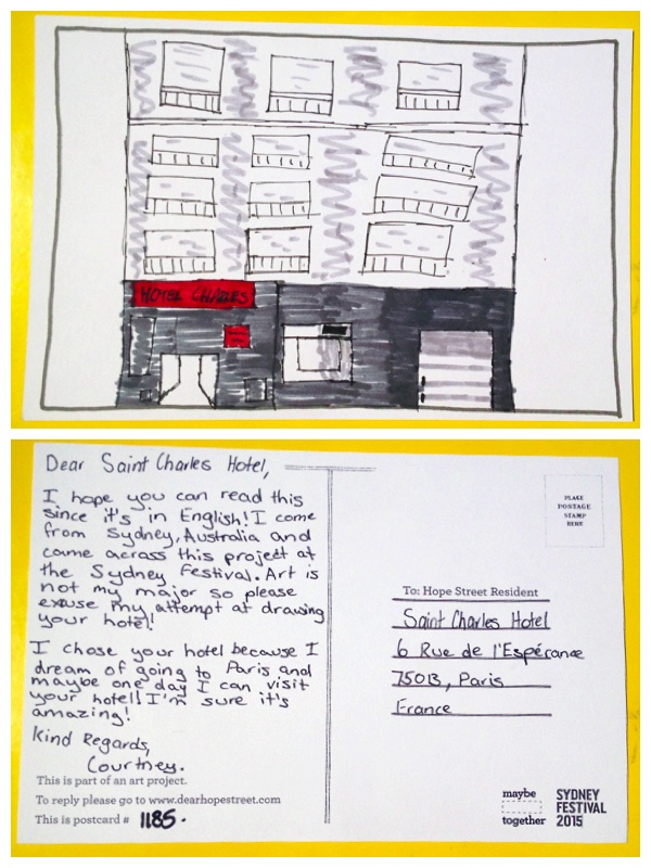 Cher Hotel Saint Charles. J’espère que vous pouvez lire ceci car c’est en anglais ! Je viens de Sydney, Australie et suis tombé sur ce projet au Festival de Sydney. L’Art n’est pas ma discipline donc veuillez excuser ma tentative de dessiner votre hôtel ! J’ai choisi votre hôtel parce que je rêve d’aller à Paris et peut-être, un jour, je visiterai votre hôtel ! Je suis sûr que c’est incroyable. Sincères salutations, Courtney.
