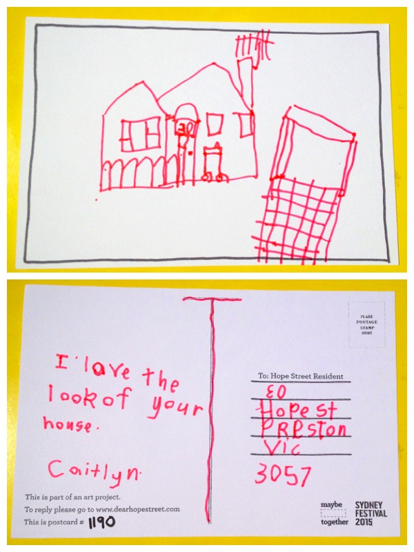 Thank you for your beautiful postcard! We actually rent this house and only moved in on February 18. To find your postcard in the mailbox was the loveliest surprise for us. We have a little baby boy called Henry and he is just 8 months old. We have your postcard on our fridge and he likes to look at it and touch it. We like the look of our house too and Henry especially likes the trees and flowers. Your drawing is wonderful and we feel very special to be part of this project.