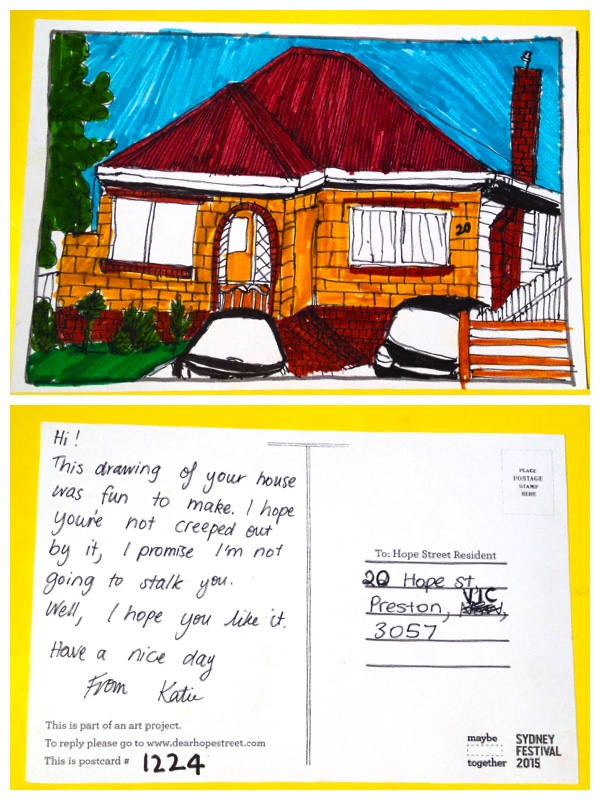 Hi Katie! Thank you very much for your postcard- it was so detailed! You’re a wonderful artist! :) All the best! :) 20 Hope St Preston